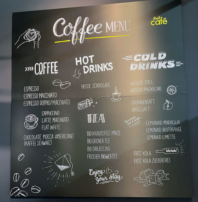 For a couple of years now I have been booked by „die veranstaltungsmacher“ to create the chalkboard menu for different trade show appearances of Royal Dutch Shell. Legibility and decorative elements are very important to the client.